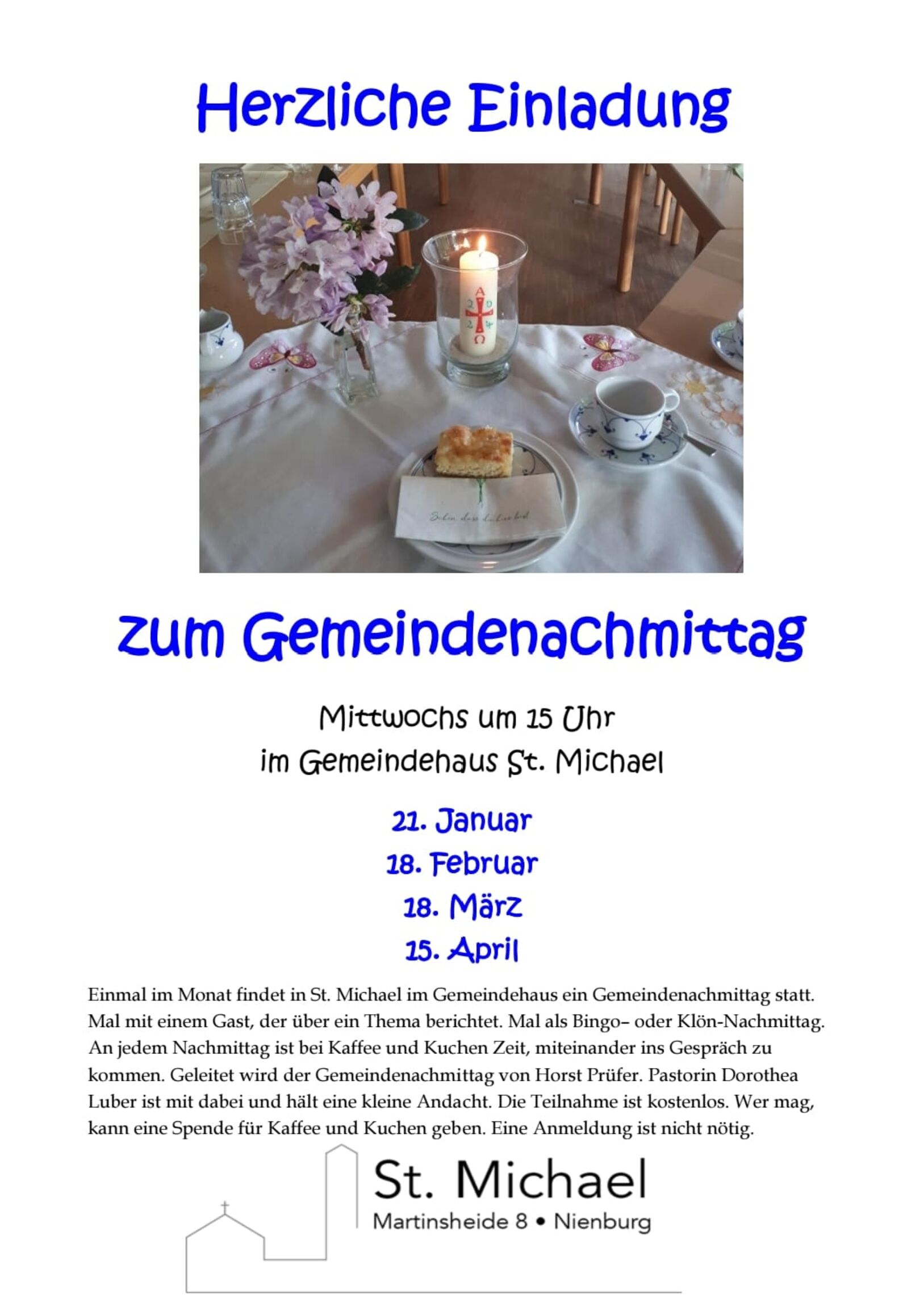An jedem Nachmittag ist bei Kaffee und Kuchen Zeit, miteinander ins Gespräch zu kommen. Geleitet wird der Gemeindenachmittag von Horst Prüfer. Pastorin Dorothea Luber ist mit dabei und hält eine kleine Andacht. Die Teilnahme ist kostenlos. Wer mag, kann eine Spende für Kaffee und Kuchen geben. Eine Anmeldung ist nicht nötig.